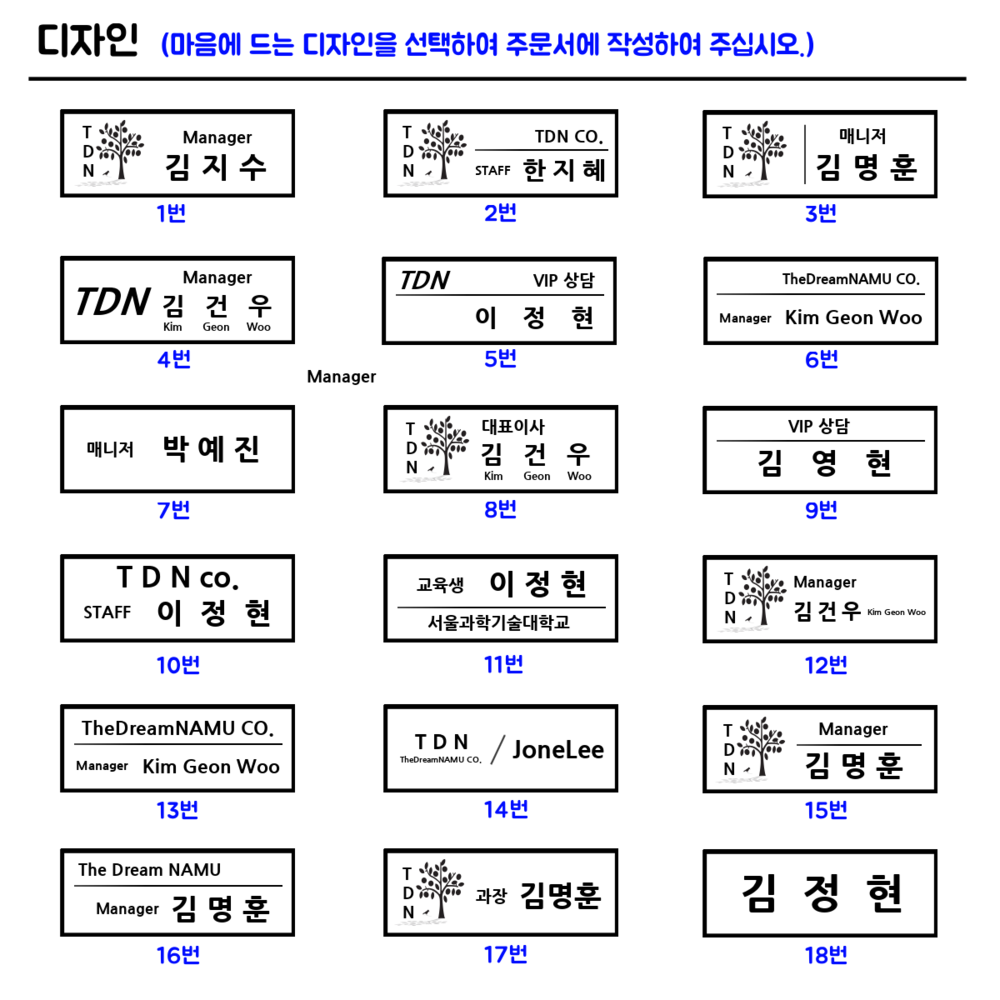 1. 명찰 종류 (재질, 색상 등)을 선택하여 주십시오.