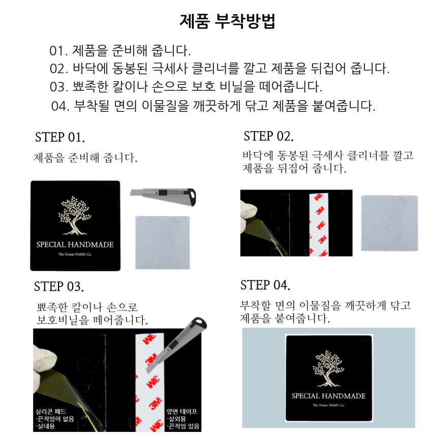 양면 테이프(실내외 공용), 실리콘 패드(실내용 끈적임 없음), 타공명판(테이프 필요없음)